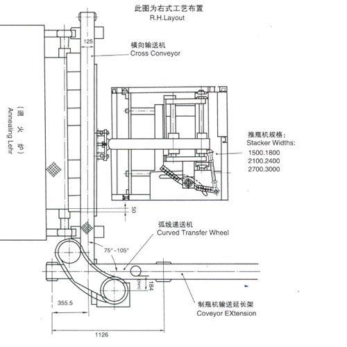 該機組是我廠在1988年消化吸收西德派尼康姆公司的技術(shù)制造的,具有國際九十年代先進水平,可與QD4A、QD6A、QD6C、QD8A、QD8D等單滴料制瓶機和六組 、八組、十組、十二組、雙滴料制瓶機配套使用;與供料機、制瓶機保持嚴格的同步運行,將玻璃制品連續(xù),等距離地自動排列,避免碰撞,倒伏,磨擦現(xiàn)象,有效地提高玻璃制品的合格率,并保證其退火質(zhì)量,為冷端噴涂提供了良好的條件,該機組適用于任何形式任何規(guī)格的退火爐,尤其適用于電加熱的退火爐。